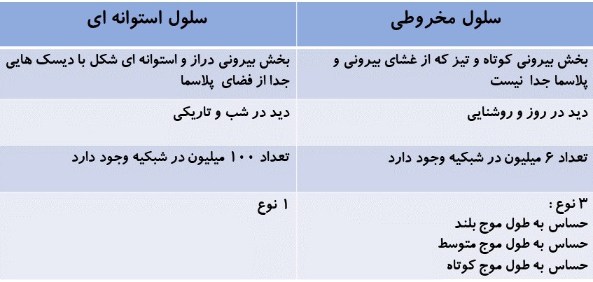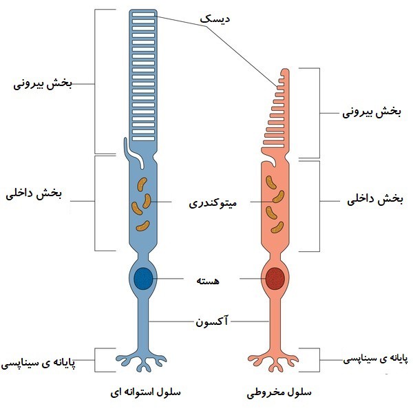 سلول گيرنده های نوری (مخروطی و استوانه ای) از نظر عملكرد به چهار قسمت تقسيم مي شوند :